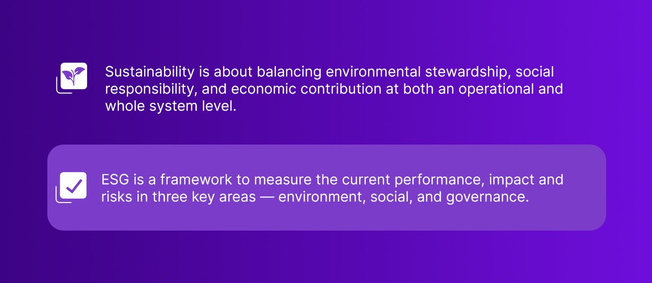 If you’re looking to enhance your practices, it’s important to understand ESG and sustainability similarities, their differences, and how they work together to benefit business outcomes.